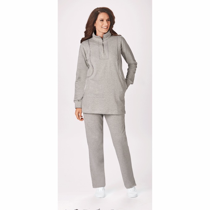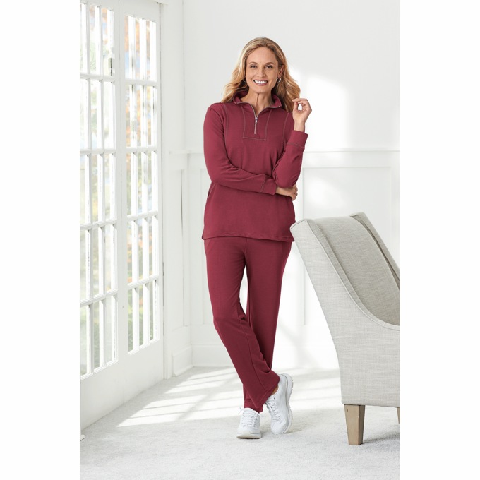 French terry set has a 1/4-zip top and stylish collar. Pant has all-around elastic waistband and two side-seam pockets. Cotton/polyester; machine wash. Imported. Misses Top 28"; Inseam 29"; Plus Top 30"; Inseam 30".Ā