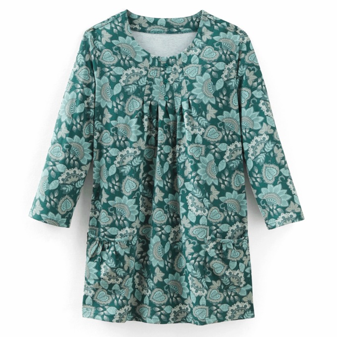 With pleated and henley-style neckline, this jersey knit tunic has patch pockets for easy wearing. 100% cotton. Machine wash. Imported. M 30"; W 32".