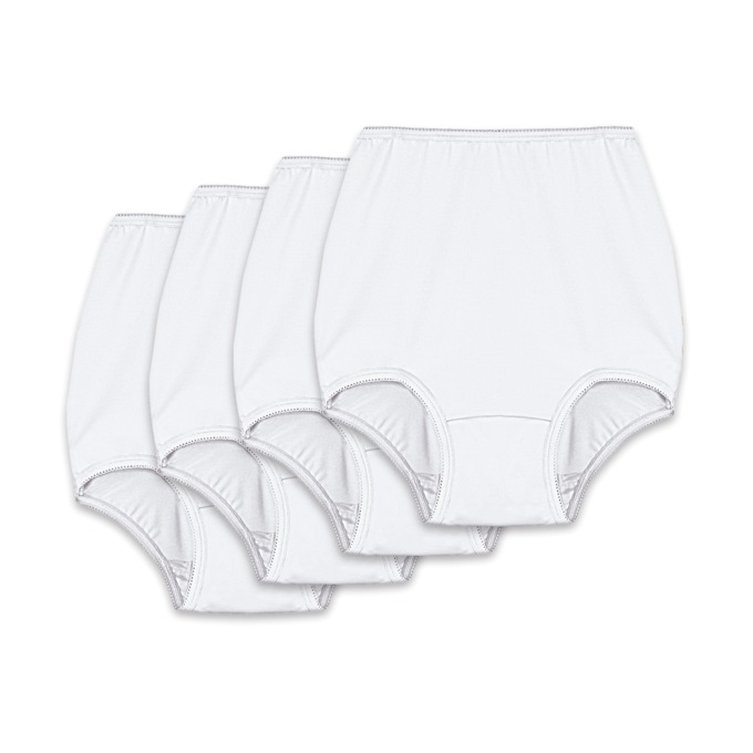 Full-cut polyester/spandex knit briefs stretch for comfort. Elastic waist and cotton-lined crotch. Hand wash. Imported.