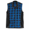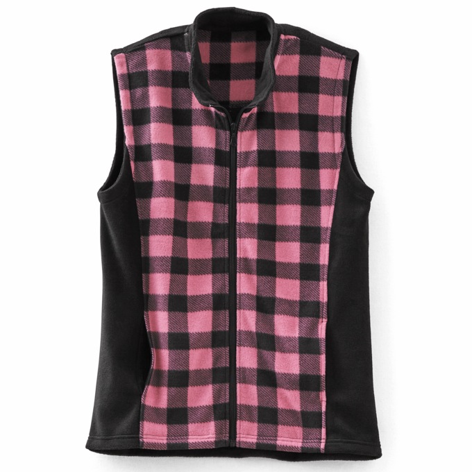 Vest with buffalo check plaid print front, black contrast sides and back, and stand-up collar. Zip front and on seam pockets. 100% polyester knit. Machine wash. Imported.