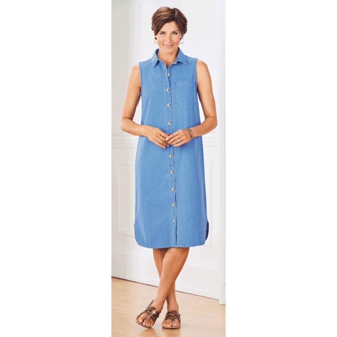 Casual cotton/polyester denim dress can also be worn with a belt and leggings. Back pleat. Machine wash. Imported. Misses 42"; Plus 44".