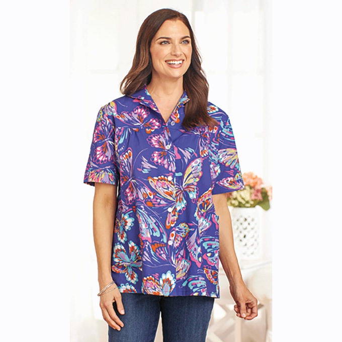 Easy-care top with patch pockets and short sleeves with mock cuffs. Woven cotton/polyester. Imported. M 28"; W 30".