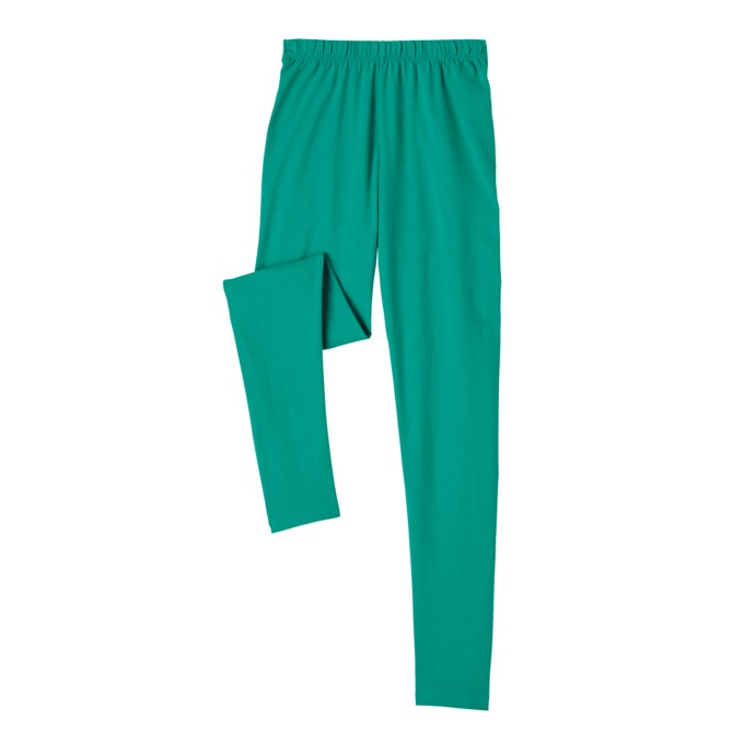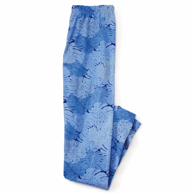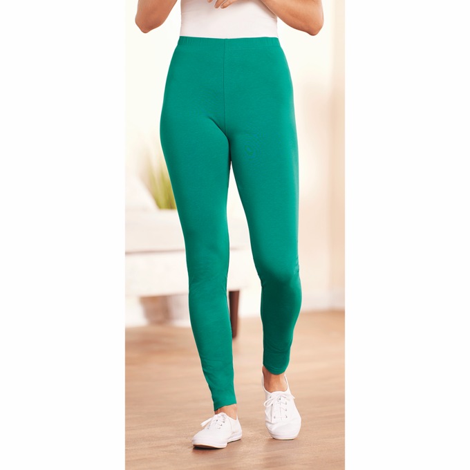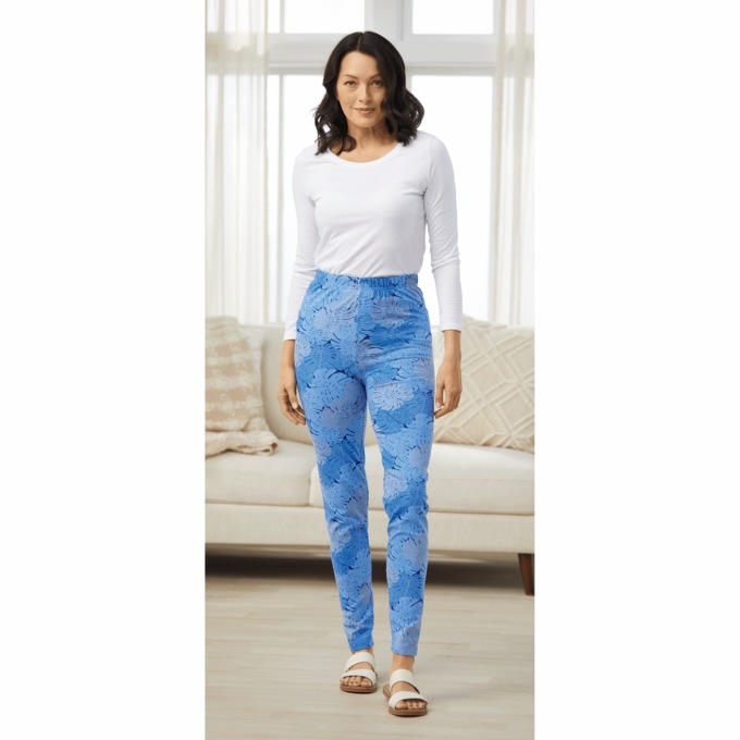 Elastic waist and stretch for all-day comfort. Solid colors cotton/spandex knit; Heather Gray cotton/viscose/spandex knit; Charcoal cotton/polyester/spandex knit. Machine wash. Imported. Petite 25"; Misses 27", Plus 27".Ā