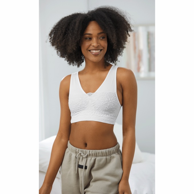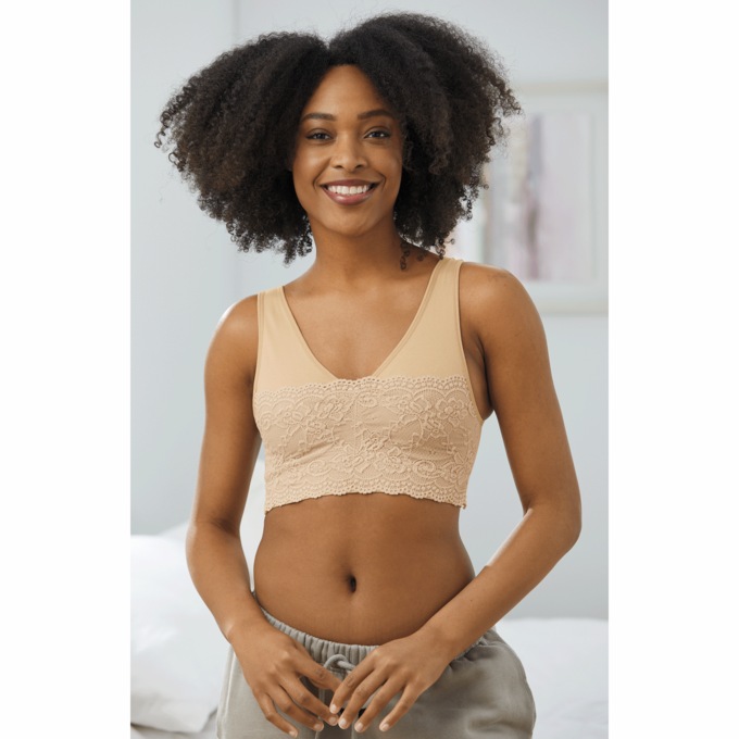 Fashion meets freedom in this stretchy pullover bra with knit lace overlay. Closure-free. Nylon/elastane. Machine wash. Imported. Order by band size: S(32-34"), M(36-38"), L(40-42"), XL(44-46"), 2X(48-50"), 3X(52-54").