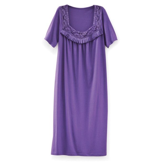 This pretty lace trimmed nightgown is styled in soft cotton/polyester knit with a sweetheart neckline, romantic lace yoke and lovely satin trim. Semi-fitted style. Machine wash. Imported. M 41"; W 43".