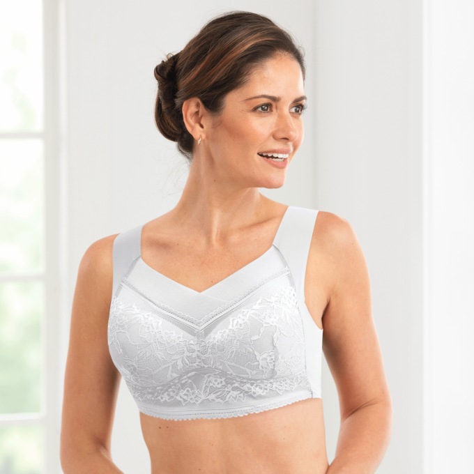 Wire-free design comfortably lifts and shapes while mesh trim provides added coverage. Pull-over, bralette style. Wide, non-adjustable straps and underband provide added support. Nylon/spandex. Hand wash. Imported. S(36A-38A/B), M(38C-38D), L(40A/B/C/D), XL(42A/B/C/D), 2XL(44 A/B/C/D).