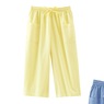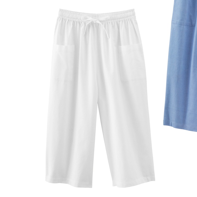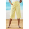 Woven capri with soft textured crinkle, full elastic waist with front patch pockets. 100% cotton. Machine wash. Imported. 22" Inseam.