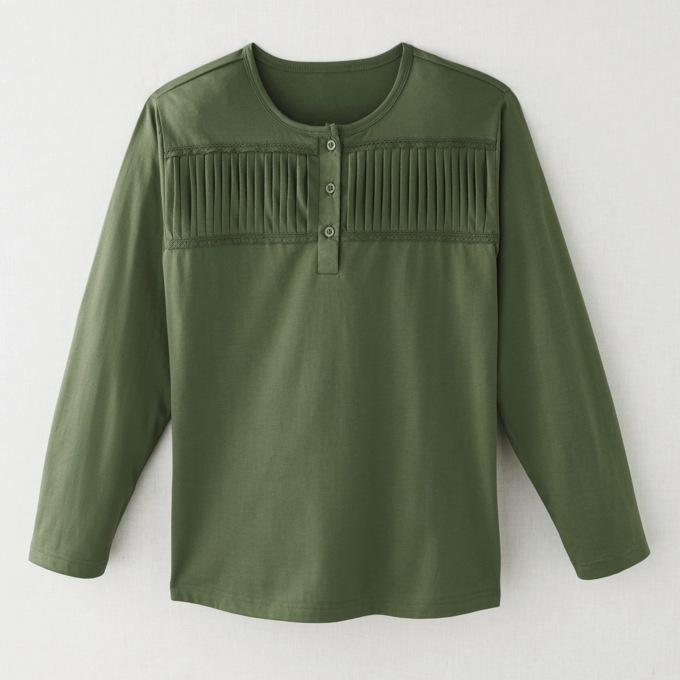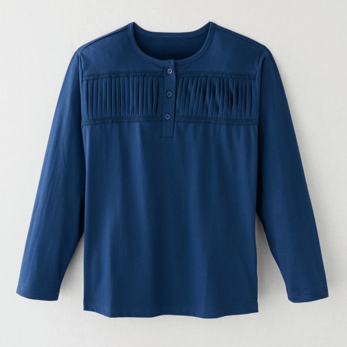 Stylish comfort at its best. Partial button-front top with wave-pintucking and lace trim, long sleeves and relaxed fit. Cotton/polyester knit. Machine wash. Imported .