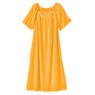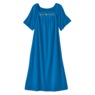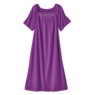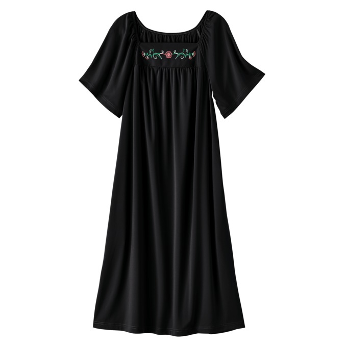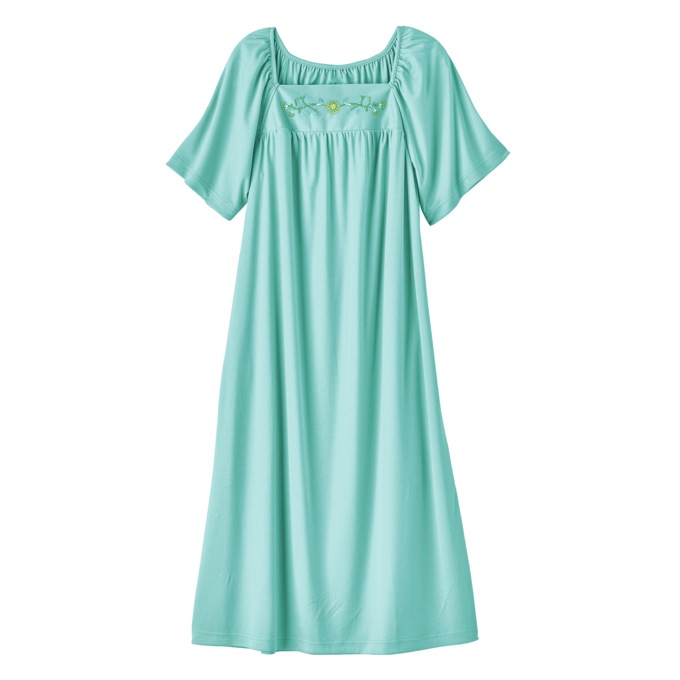 With gentle shirring on yoke and sleeves. Side seam pockets. Polyester knit. Machine wash. Imported. M 42"; W 44".