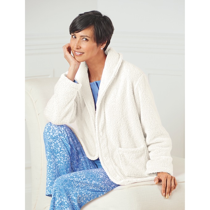 Jacket has button front, shawl collar and patch pockets. Soft polyester knit. Machine wash. Imported. M 25", W 27".
