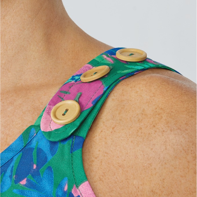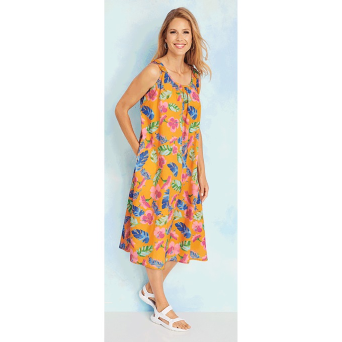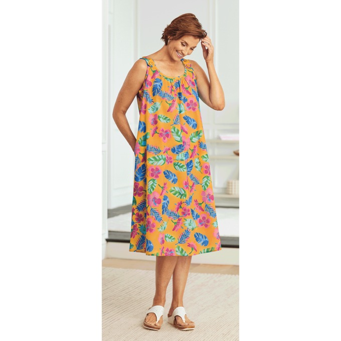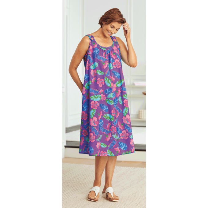 Slipover shift with adjustable button shoulder straps and handy side seam pocket. Woven cotton/polyester. Machine wash. Imported. Misses 42"; Plus 44".