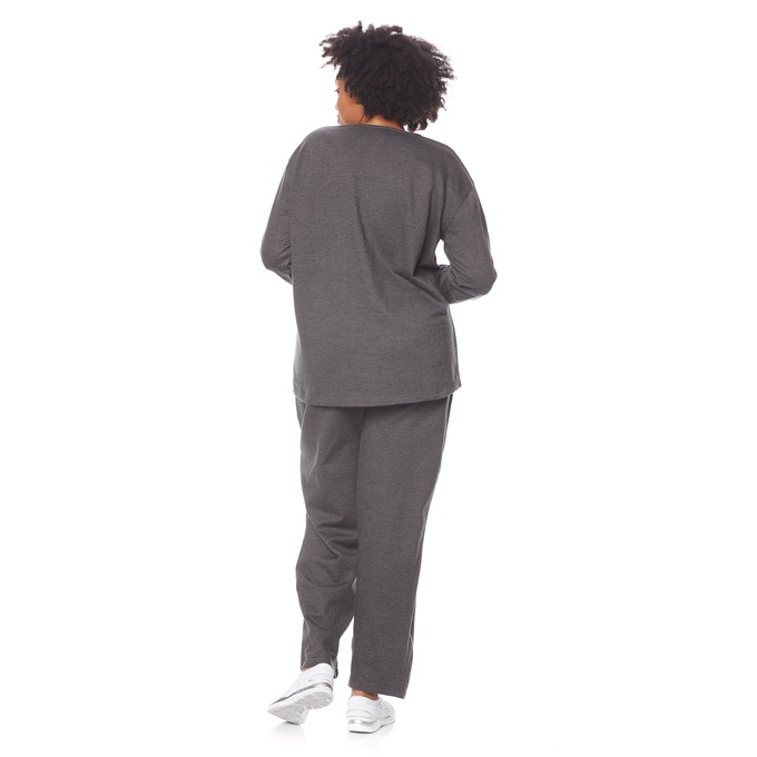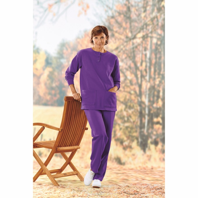 Tunic with partial button front and patch pockets. Pants with elastic waist. Cotton/polyester knit fleece; machine wash. Imported. Petites top 26", inseam 27"; Misses top 28", inseam 29"; Plus top 30", inseam 30".