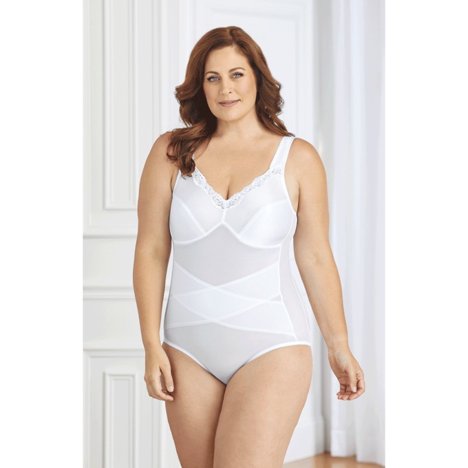 With panels at the back and front for shaping and control, the crisscross design of the Body Briefer offers firm control. Back design reduces strain and gives extra support. Pull-on style with hook-and-eye gusset. Nylon/spandex knit. Machine wash. Imported.
