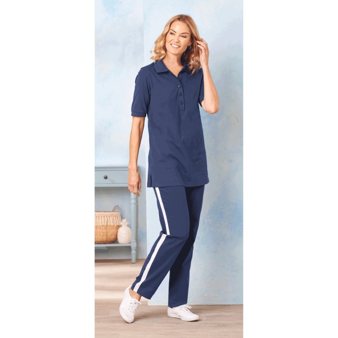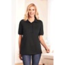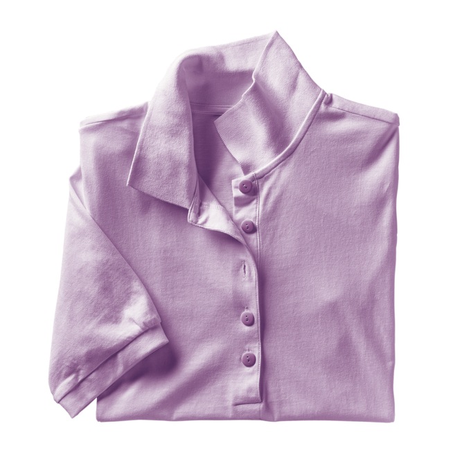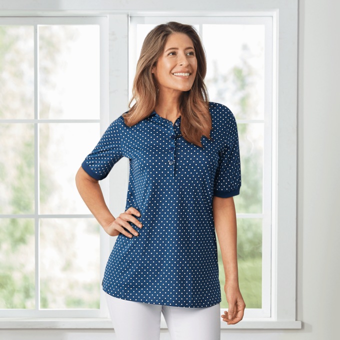 Breathable, easy-care, polo-style top with a partial button placket and fold-over collar. Side-seam vents at hem and short sleeves. 100% cotton. Machine wash. Imported. Petite 26"; Misses 28"; Plus 30".