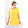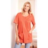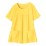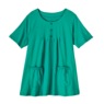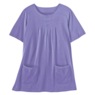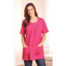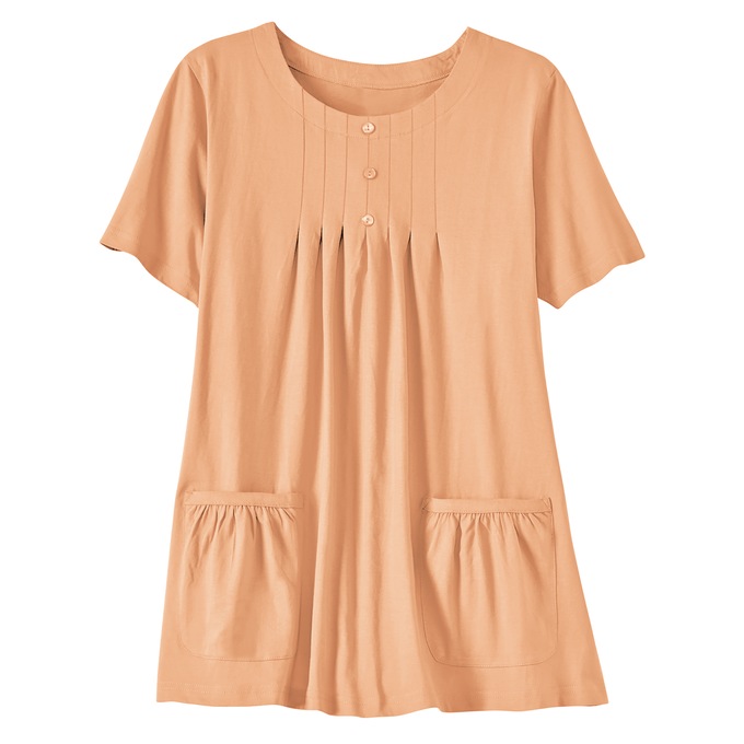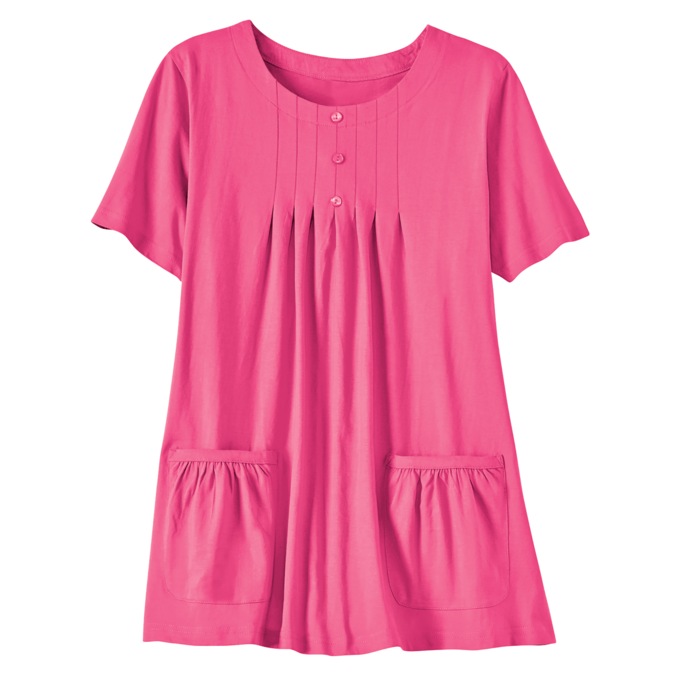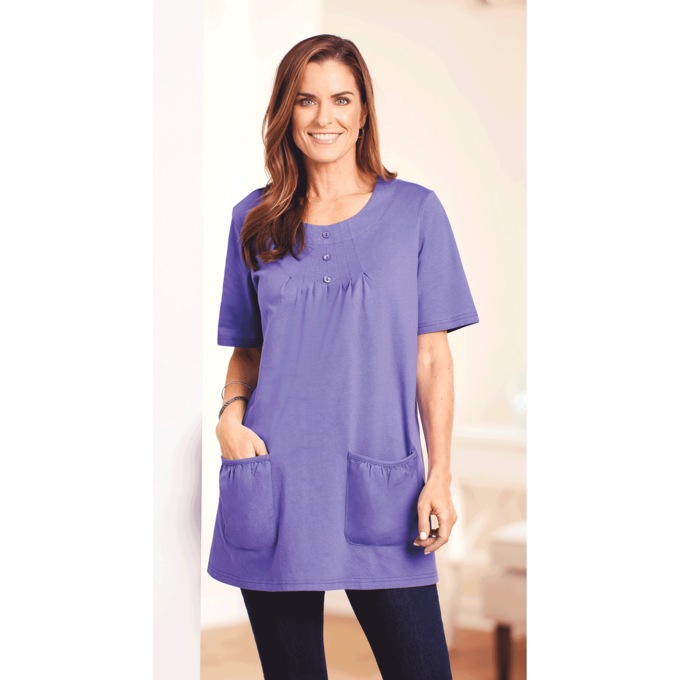 Short-sleeve tunic features button accents, pleating and patch pockets. 100% cotton knit. Machine wash. Imported. M 30", W 32".