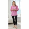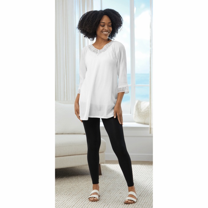 Pretty crinkle cotton tunic with feminine wide lace trim at the neckline and on the 3/4-sleeve cuffs. 100% cotton. Machine wash. Imported. M 30". W 32".