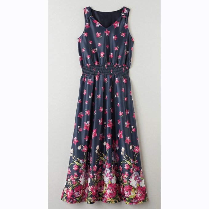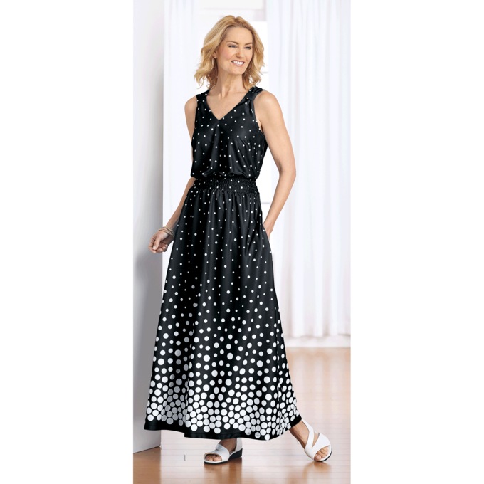 Full-length, tank style sundress with a stretch smocked waist. Side seam pockets. V-front neckline Easy care polyester knit. Machine wash. Imported. Misses 52"; Plus 53".