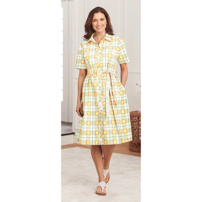 Button-front dress with collar features self-tie belt. Side seam pockets. 100% cotton. Machine wash. Imported. M 42"; W 44".