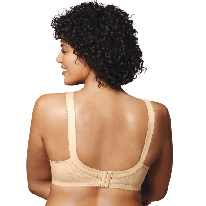 This wirefree 4-way stretch lace bra is fashioned around the famous Playtex® M-frame that comfortably conforms to your shape. The Comfort Cushion stretch straps adjust in front and are designed to prevent shoulder strain. Back closure. Nylon/latex/polyester/cotton/spandex. Hand wash. Imported.