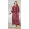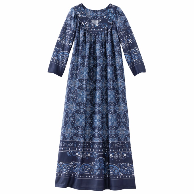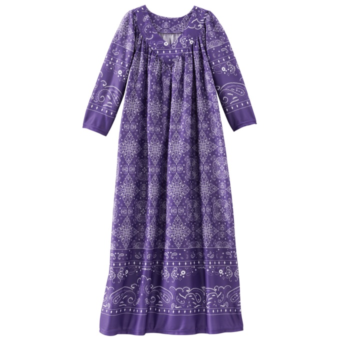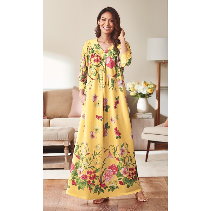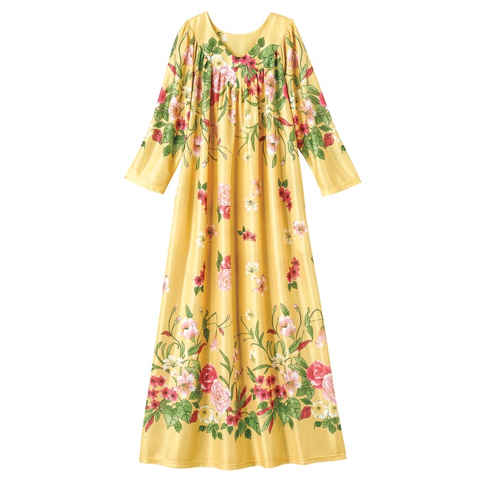 Silky lounger with generous shirring. 3/4 sleeves; side seam pockets. Polyester knit. Machine wash. Imported. M 52"; W 54".
