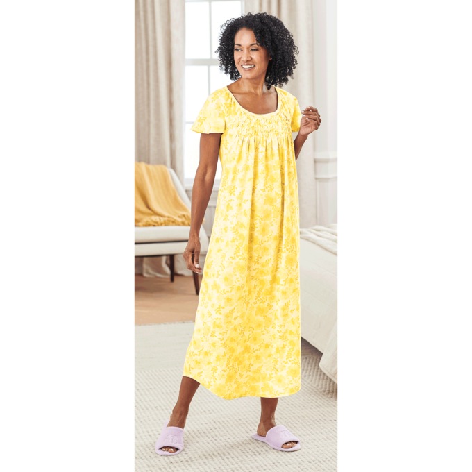 A soft jersey knit gown with smocking is just what you need for comfortable nights. 100% cotton. Machine wash. Imported. Misses 46"; Plus 48".