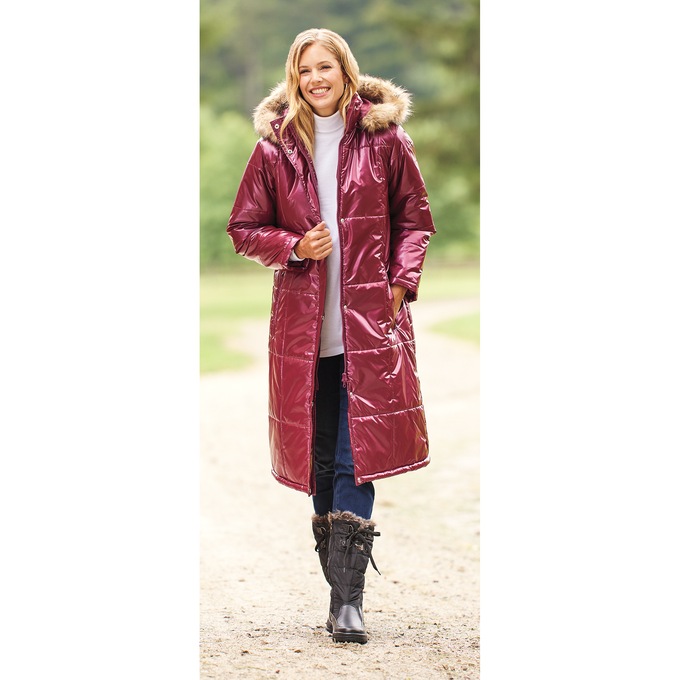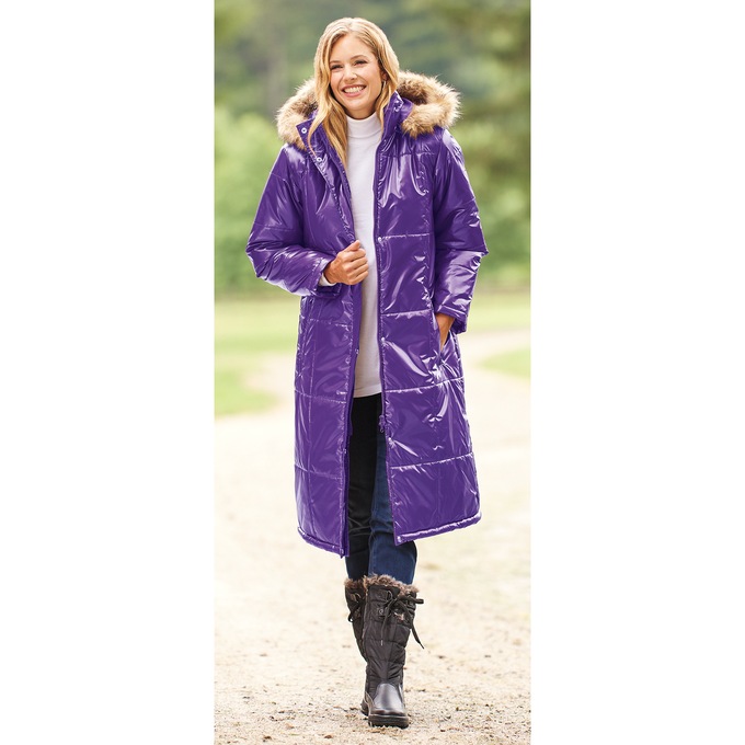 Slip into cozy warmth before walking out the door! Polyester filling and faux fur-trimmed, detachable hood. Two-way zip and snap closure. Zippered front pockets. Polyacrylate coating on woven polyester. Machine wash. Imported. M 42"; W 44".