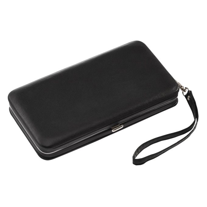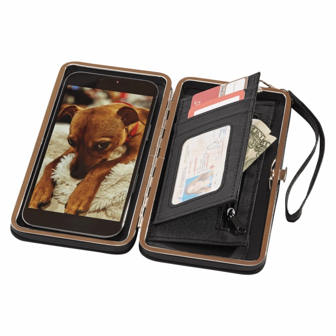 Streamline your essentials and keep them safe in this compact, functional phone wallet. Its hard shell, metal case protects your phone and valuables plus it is RFID blocking. Soft suction cup insert ensures a firm grip when on the move. 6 credit card slots, 1 ID window, zippered change pocket and wide pocket for bills. Removable wrist strap. Leather/polyester/iron. 7.25"W x 3.88"H x .88"D closed.