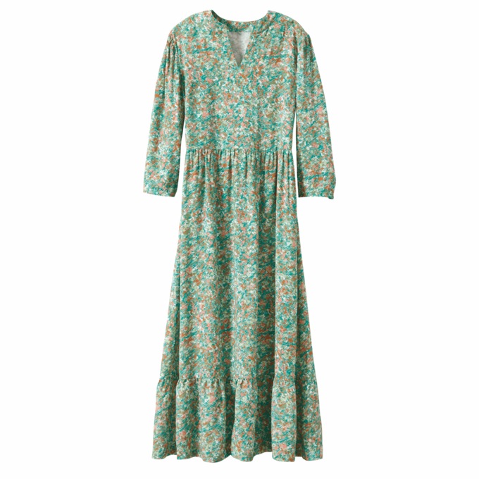 Jersey free-flowing dress with split neck, 3/4-length sleeves, side seam pockets, waist seam and large ruffle hem. Polyester knit. Machine wash. Imported. M 50”; W 52”.