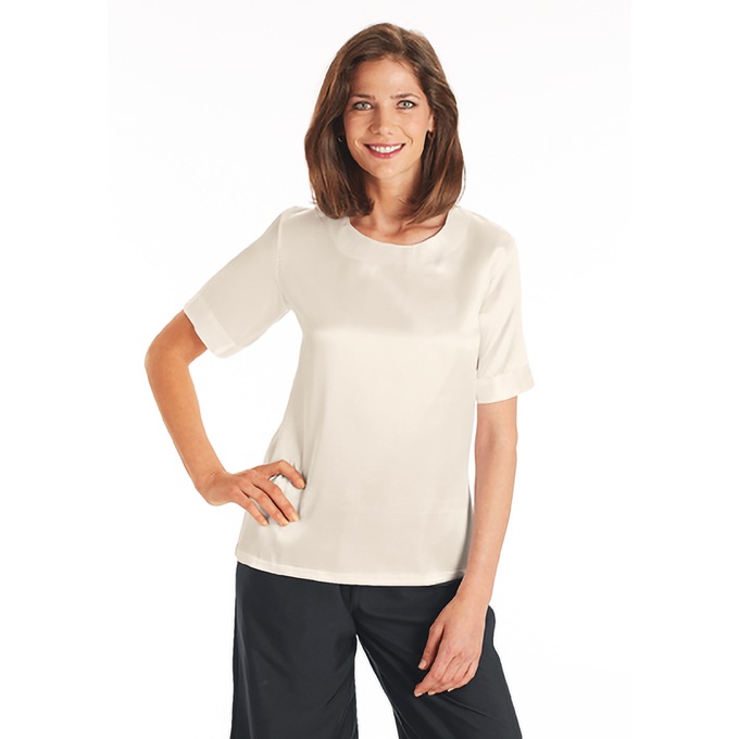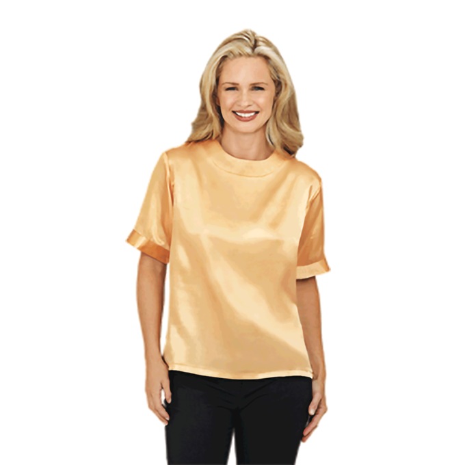 Designed with a classic crew neckline and back button keyhole, this beautiful, short-sleeve satin blouse is perfect paired with pants, skirts or suits. Woven polyester/cotton. Machine wash. Imported. P 24"; M 26"; W 28"