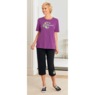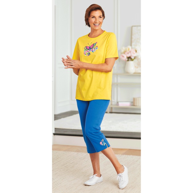 Short-sleeve top with round neck and side slits. Capris with full elastic waist, side seam pockets and side slits. 19" inseam. Cotton/ polyester knit. Machine wash. Imported.