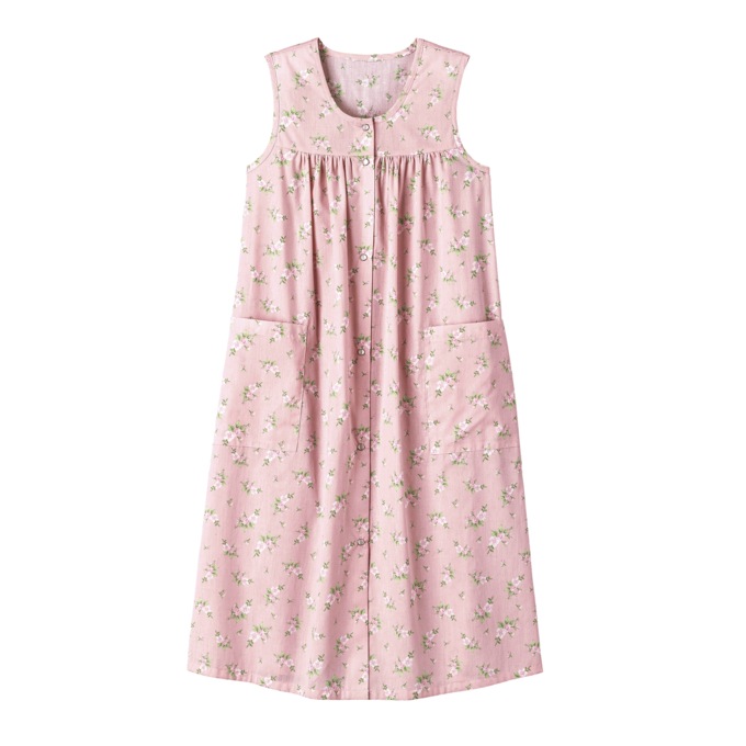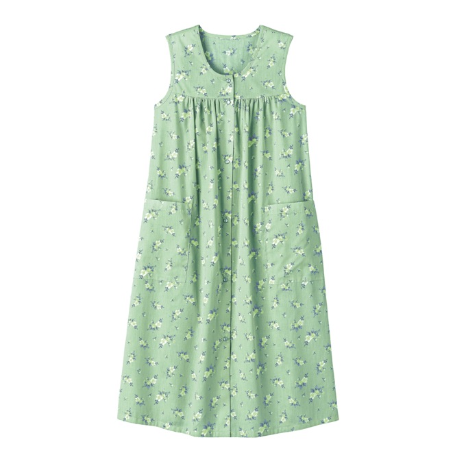 With snap front, patch pockets and front shirring, this shift dress delivers a roomy fit. 42". Woven cotton. Machine wash. Imported.