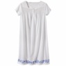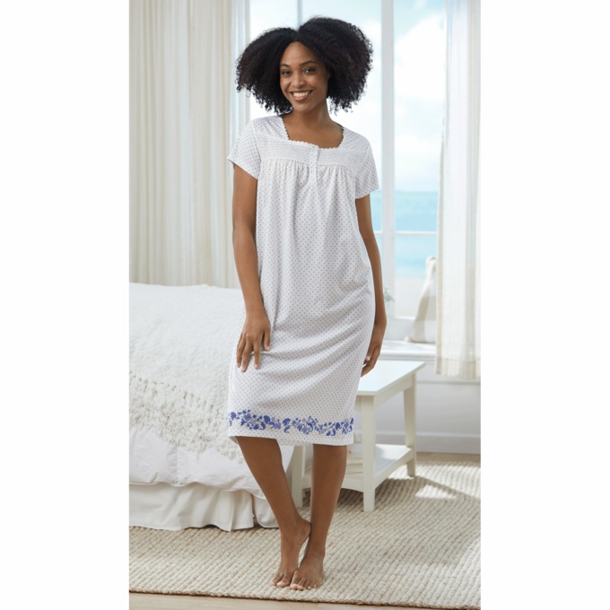 Ultra-soft, square neck gown has button placket and smocking details. Features lace trim for a feminine touch. Polyester/cotton knit. Machine wash. Imported. M 42"; W 44".