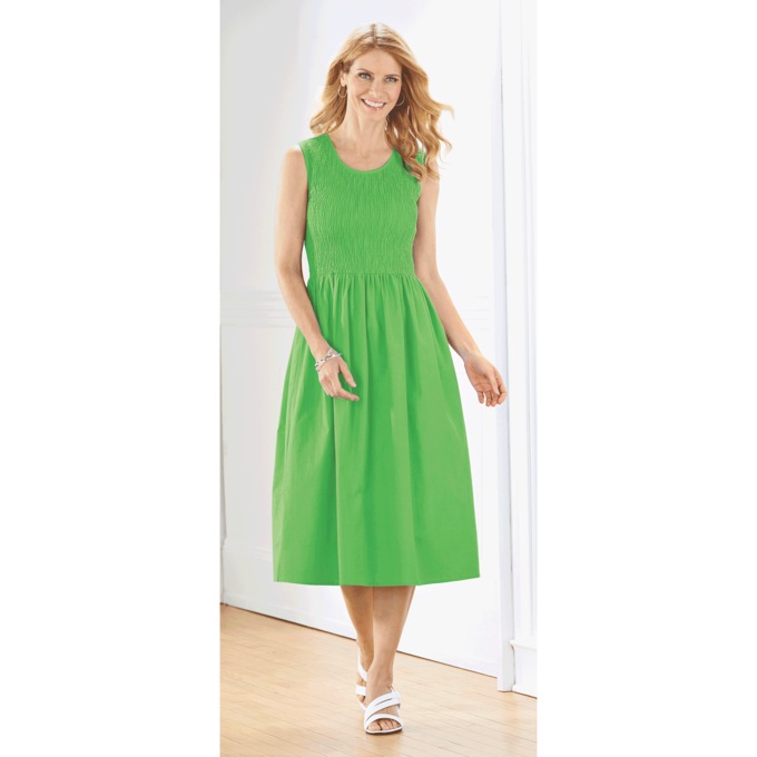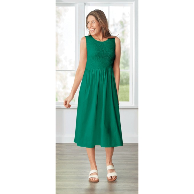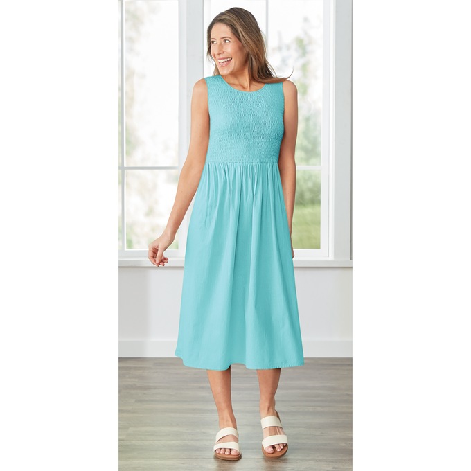 Woven of 100% cotton and styled with a smocked bodice that stretches for a comfortable fit. Tank style midi dress with waist seam and shirred skirt. Machine wash. Imported. Misses 46"; Plus 48".