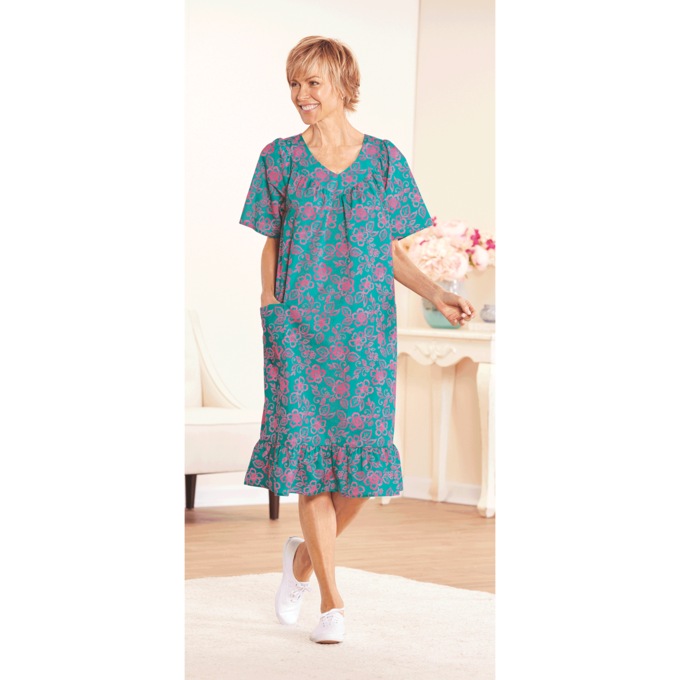 This short sleeve sundress is all about comfort, color, and carefree style. With playful prints, a flattering flounce hem, and roomy patch pockets, it’s the perfect pick for lounging at home or enjoying a sunny day on the patio. Just slip it on and feel instantly put together—no buttons, snaps or zippers required.