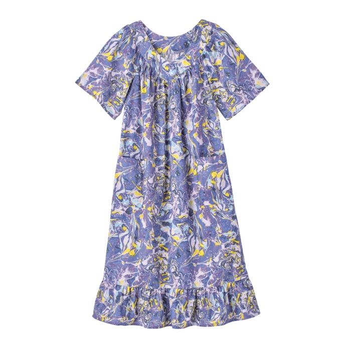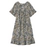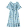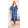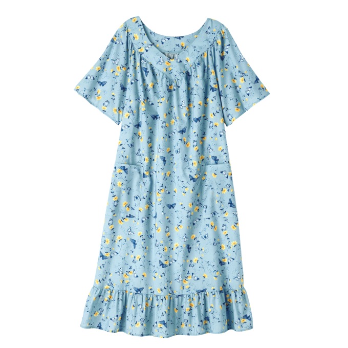 Dress with patch pockets and flounced ruffle hem. Short-sleeve and V-neck. Woven cotton/polyester. Machine wash. Imported. Petite 40"; Misses 42"; Plus 44".