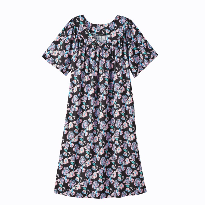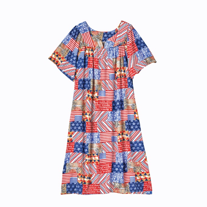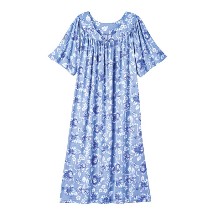 Roomy, slip-over styling with side pockets. Polyester knit. Machine wash. Imported. Misses 42"; Plus 44".