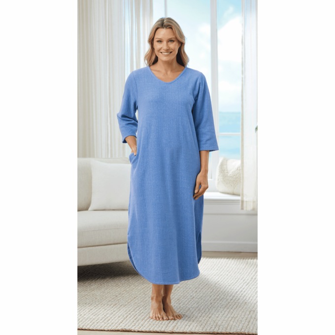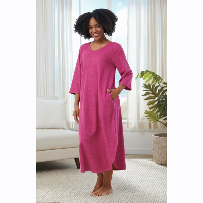 Comfortable, no-pill terry lounger with a rounded V-neck and relaxed fit. Featuring 3/4-length sleeves, pockets and side slits for easy mobility. Cotton/polyester knit. Machine wash. Imported. M 50"; W 52".