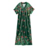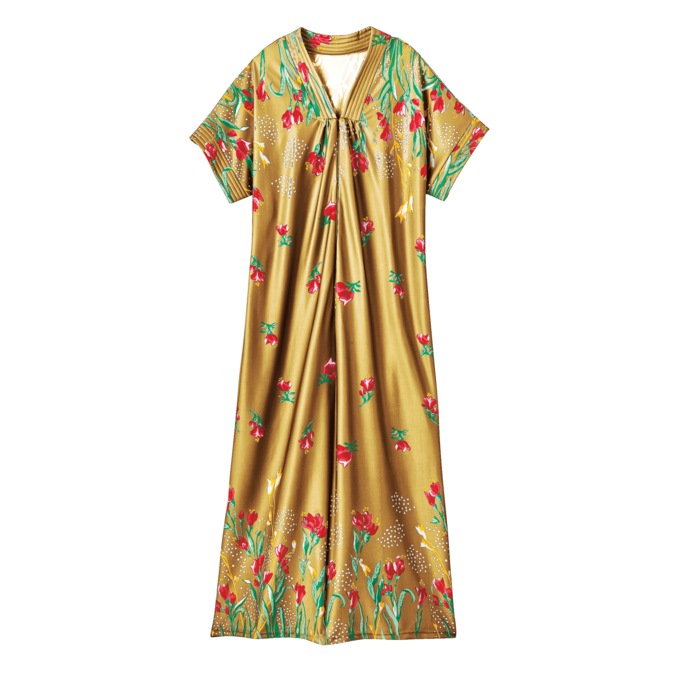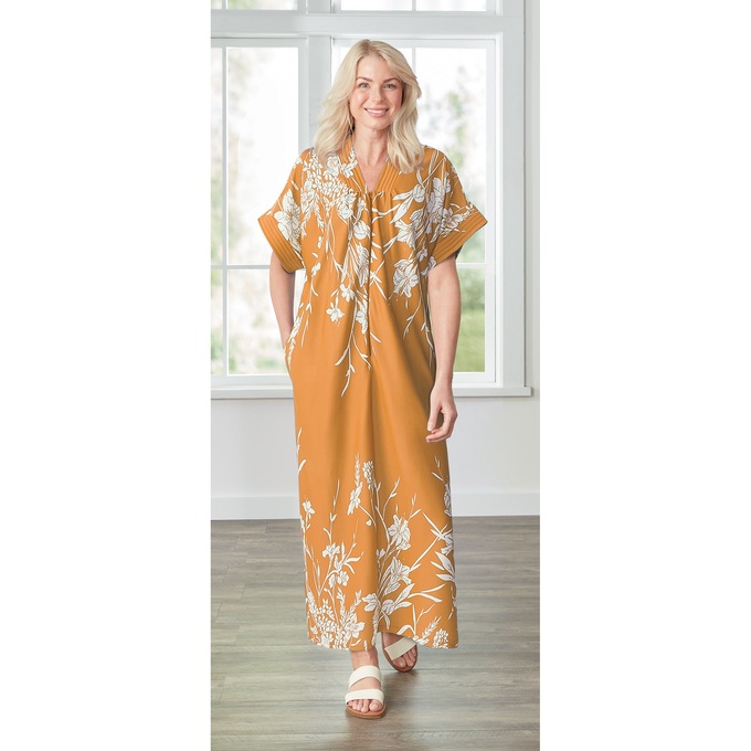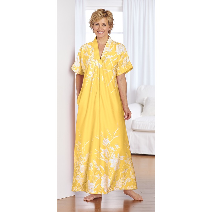 Ankle-length caftan with zip-front closure, side pockets and trapunto trim on the kimono-style sleeves. All-over print. Polyester knit. Machine wash. Imported. 52".