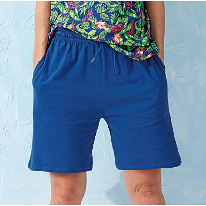 Pull-on shorts with elastic waistband with an adjustable drawstring. On seam pockets. 100% cotton. Machine wash. Imported. M 5" inseam; W 6" inseam.