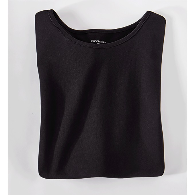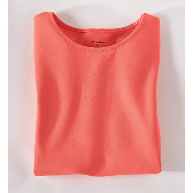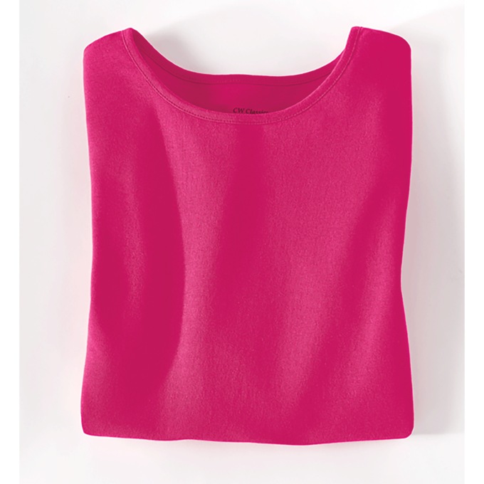 Cotton knit with a round neckline. Machine wash. Imported. M 26"; W 28".