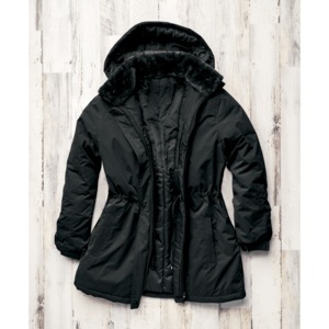 Water-resistant with zip closure and angled front pockets. Adjustable drawstring waist and detachable faux fur collar. 100% polyester with polyester fill. Machine wash. Imported. M 32"; W 34".