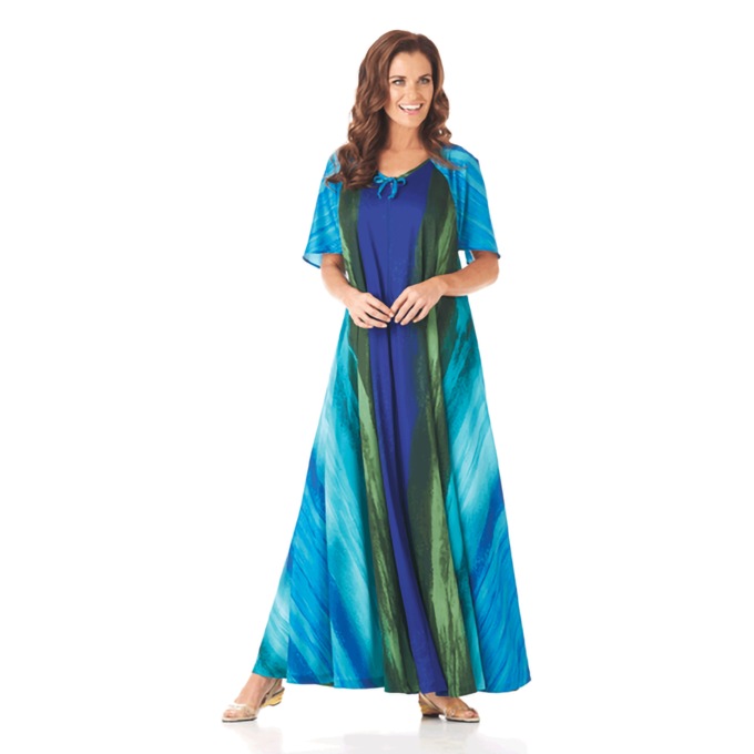 Perfect for lounging or entertaining, this vibrant knit lounger features a self tie at the V-neckline, an invisible front zipper, feminine flutter sleeves and side pockets. Polyester. Machine wash. Imported. M 52"; W 53".